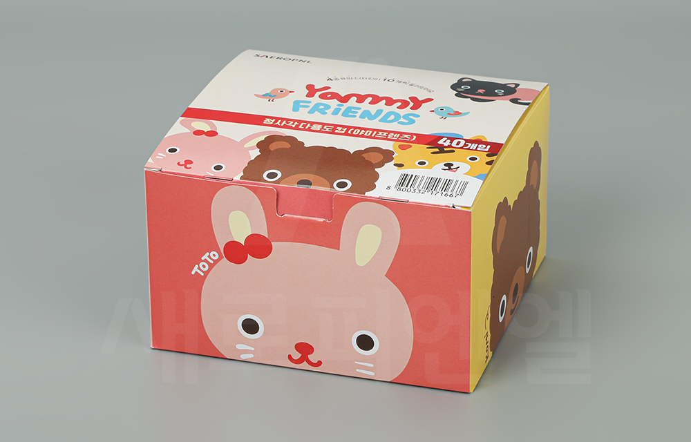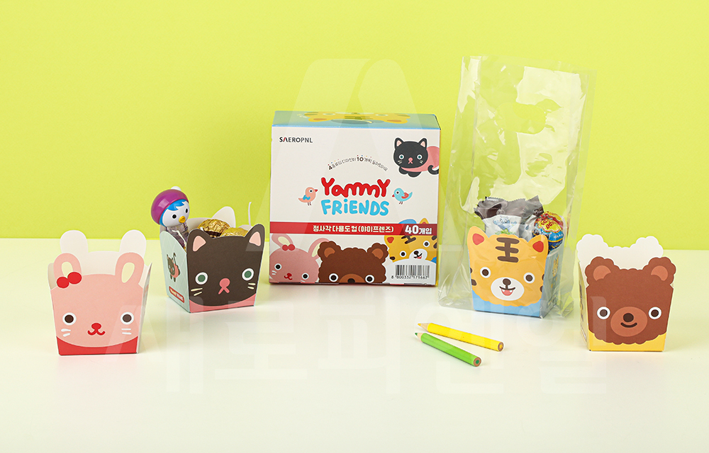 기존 정사각트레이(야미프렌즈)에서 새롭게 업그레이드된 정사각다용도컵(야미프렌즈)는 귀여운 캐릭터 디자인이 돋보이는 디저트 포장용 종이컵 세트입니다.
