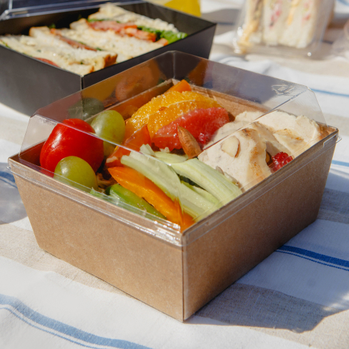 투명한 뚜껑을 통해 속이 들여다보이는 디자인으로 김밥, 샌드위치 또는 샐러드 등 다양한 음식을 담기 좋은 제품입니다.