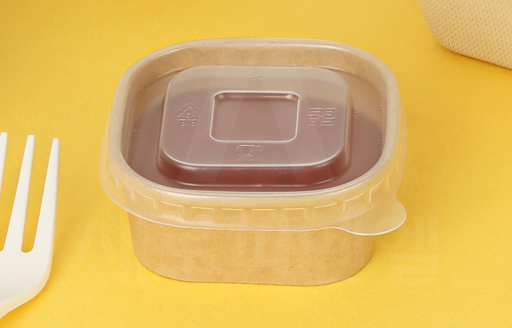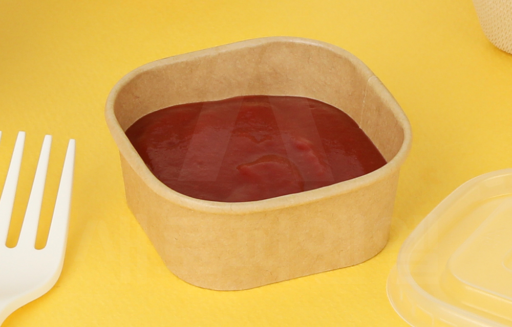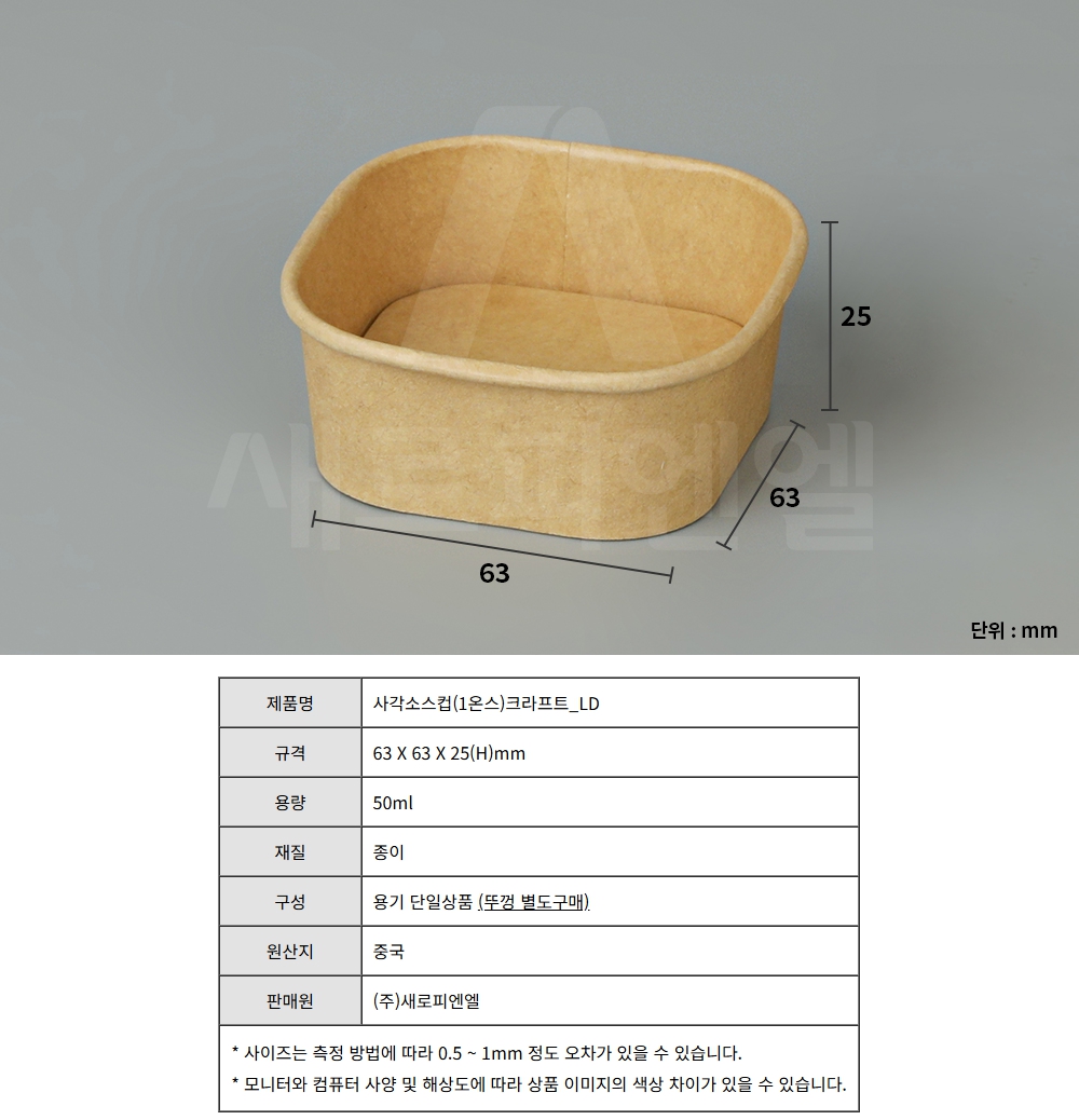 크라프트 종이 재질로 제작된 사각 소스컵으로, 소스는 물론 아이스크림과 같은 디저트까지 다양하게 담아 사용할 수 있는 실용적인 일회용 용기입니다.