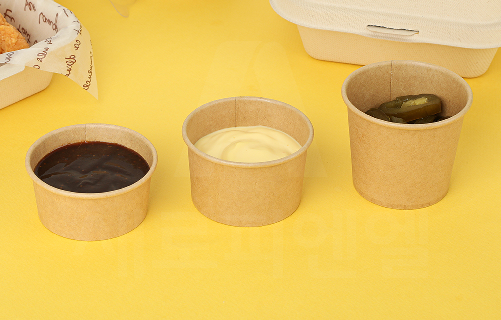 크라프트 종이 재질로 제작된 원형 소스컵으로, 각종 소스는 물론 아이스크림과 같은 디저트류까지 담아 사용할 수 있는 다용도 일회용 용기입니다.
