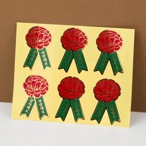 금빛으로 반짝이는 카네이션 리본 모양의 스티커입니다.
