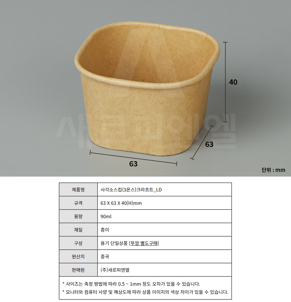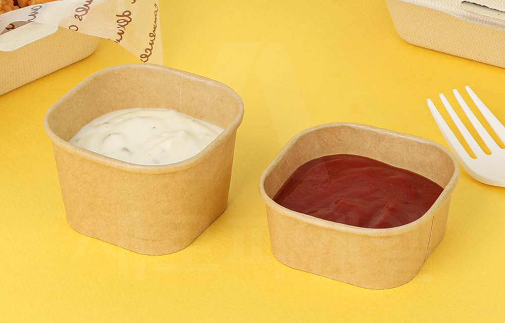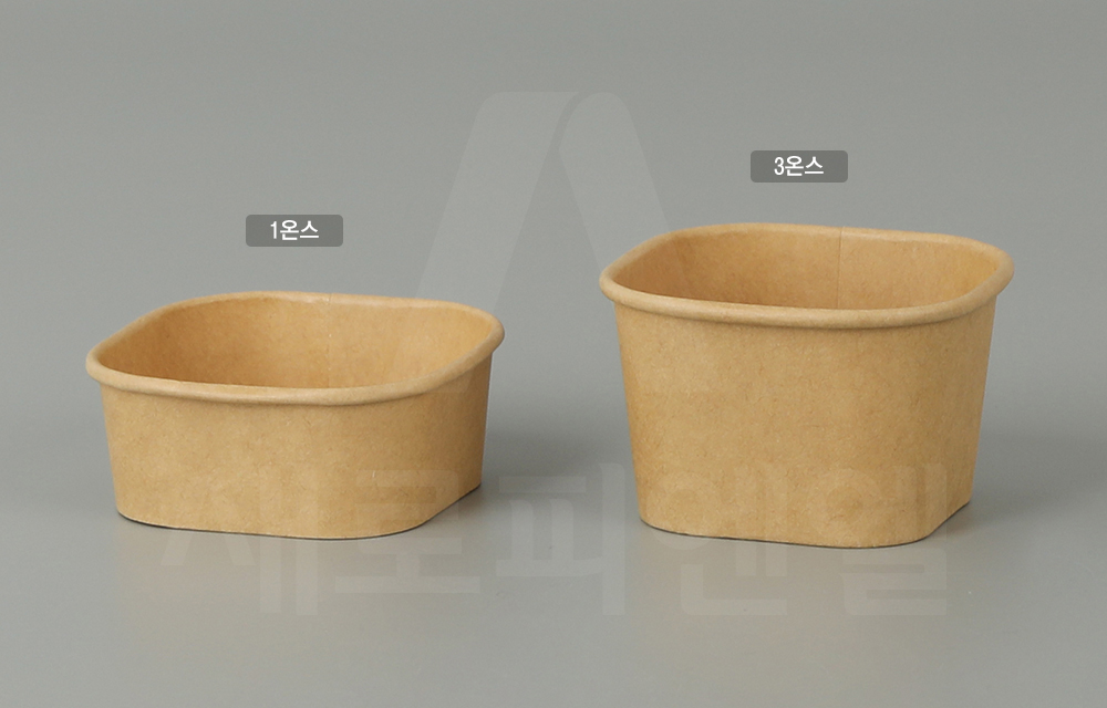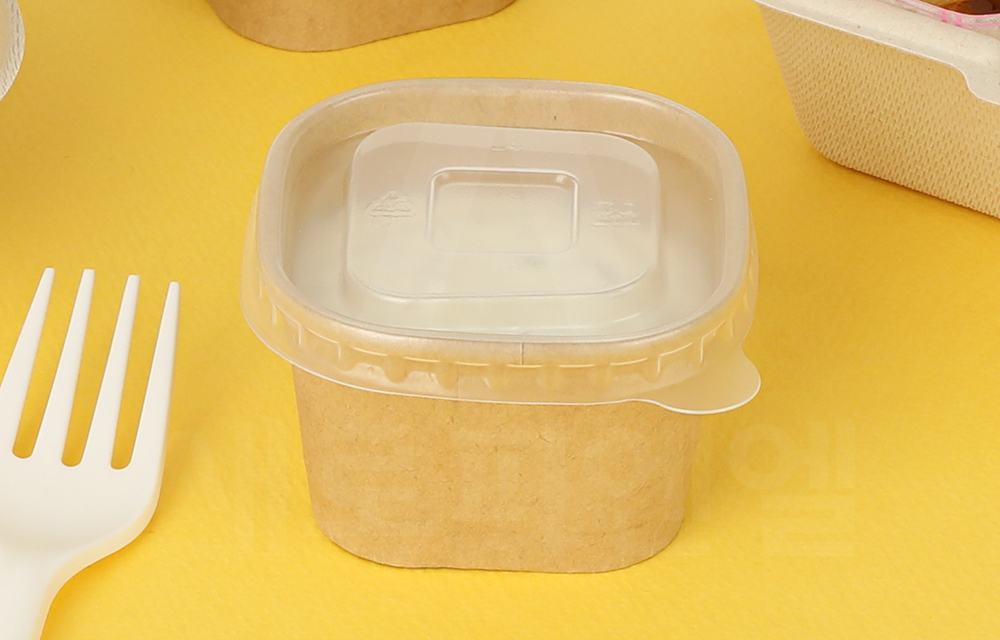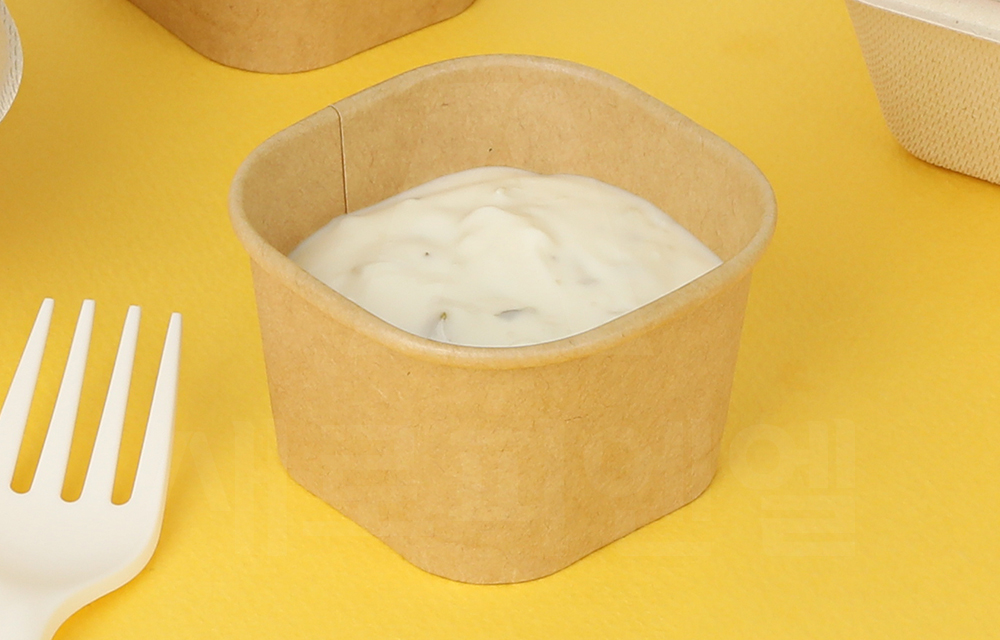 크라프트 종이 재질로 제작된 사각 소스컵으로, 소스는 물론 아이스크림과 같은 디저트까지 다양하게 담아 사용할 수 있는 실용적인 일회용 용기입니다.